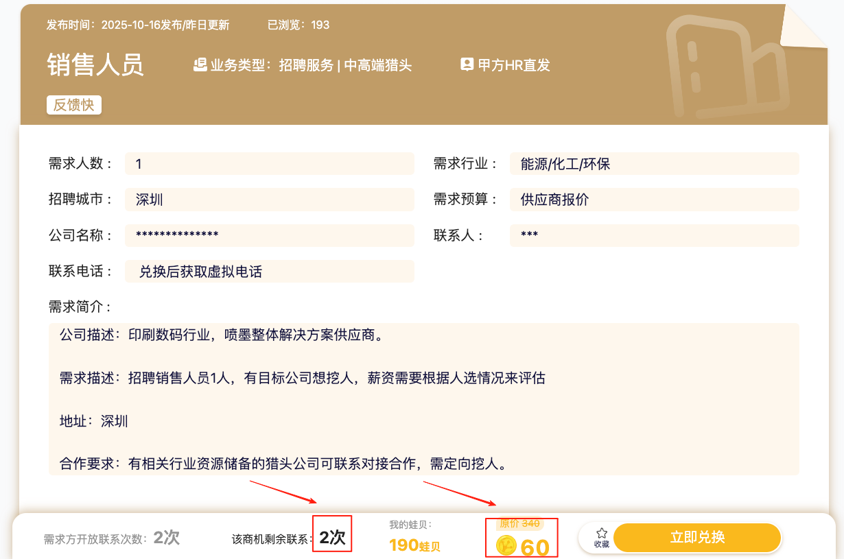 2)当选中商机显示有剩余联络次数时,可使用蛙贝兑换商机,商机兑换完成后,点击【立即拨打】,即可直联用人单位HR洽谈合作;