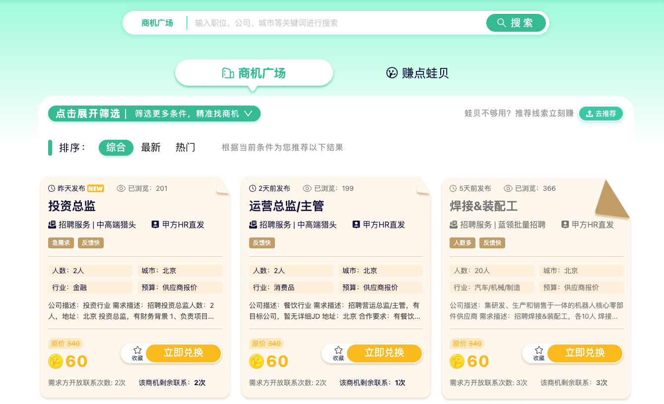 1)每日上新10+用人单位直发需求,覆盖猎头、外包等25类人力资源服务行业商机;