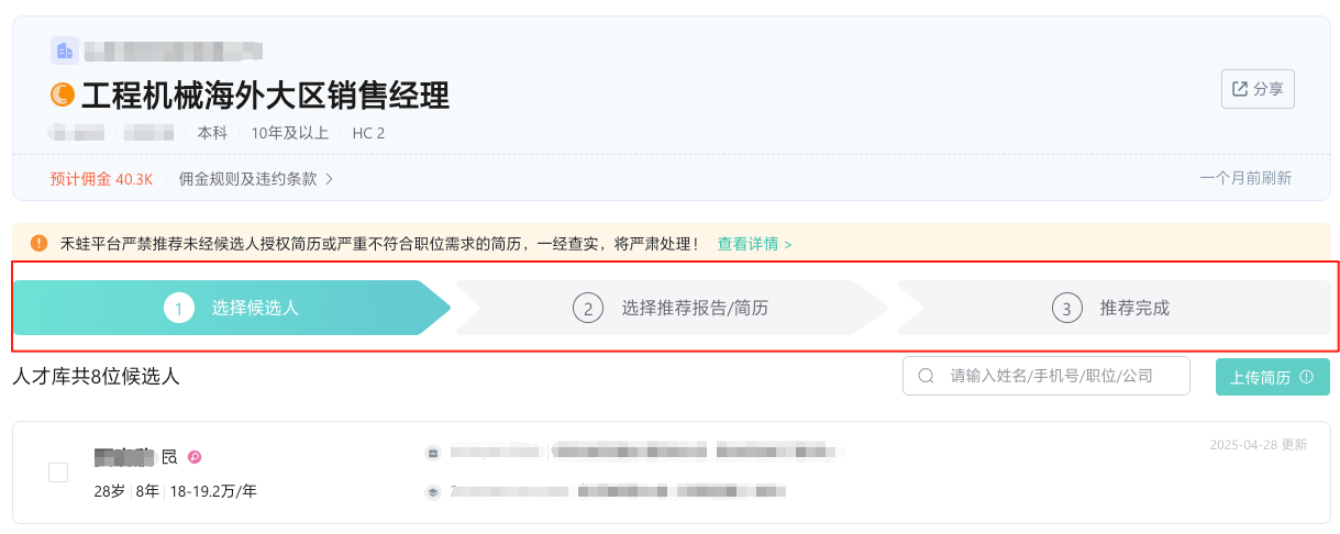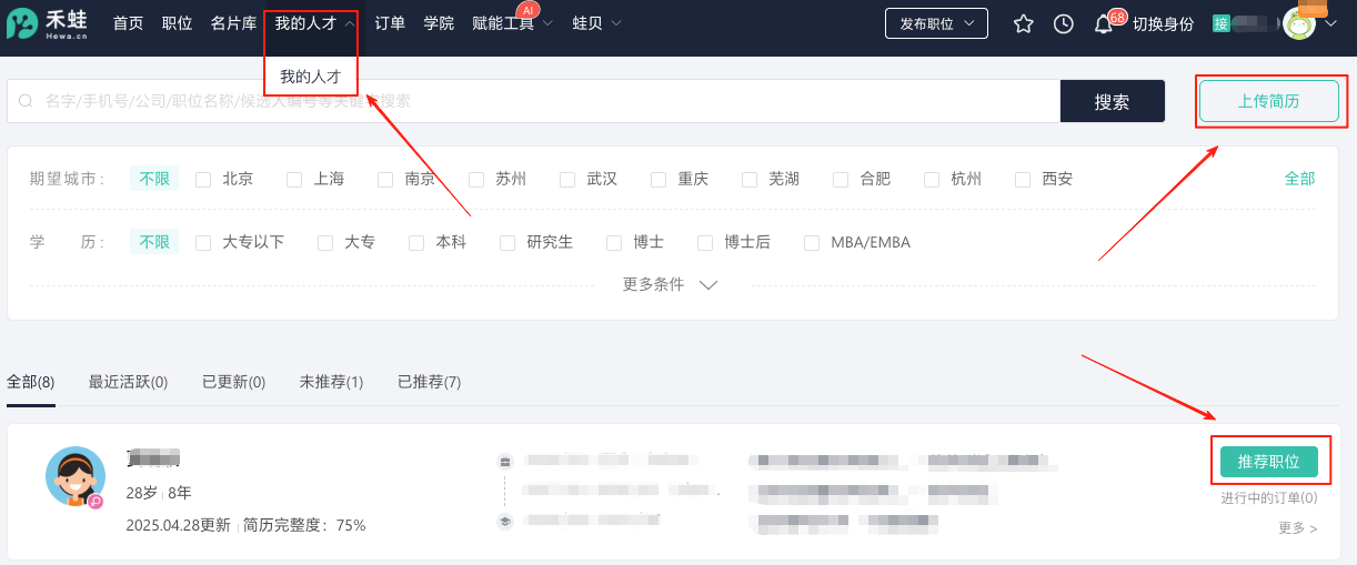 4)在“我的人才”中上传候选人简历,可隐藏候选人联系方式,再推荐到已接单的职位上,可同时推荐多位候选人,并根据职位需求制作推荐报告;