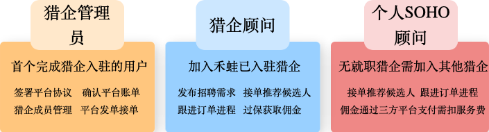 禾蛙平台是专注于链接猎企之间职位空缺和职位交付能力的撮合交易平台,猎企可以将自己寻求交付的职位发布在平台,成为发单方,支付一定的佣金寻求合作;猎头顾问也可以直接在平台接单进行交付,成为接单方,赚取佣金。