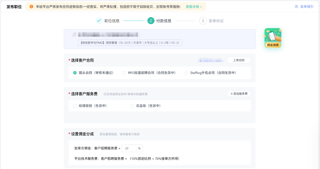 4)设置佣金:除STF外包合同外,其他合同类型均需设置佣金分成,根据调节发单方佣金比例,来调节接单方佣金所得;当发单方佣金比例高于35%时,需平台审核。