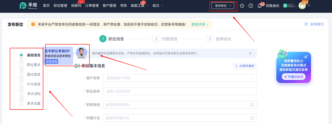 1)进入禾蛙平台网页端,点击顶部“发布职位”,切换身份为“发单顾问”,可使用“普通发单”模式即手动填写的方式、或“AI发单”/批量发单模式,根据提示填写职位相关信息;