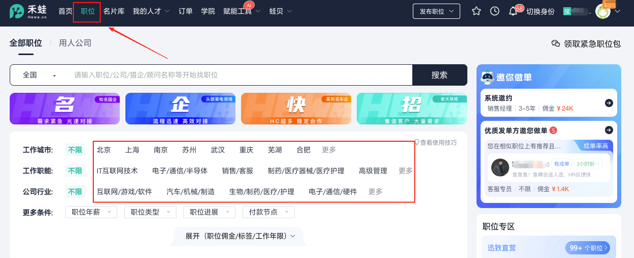 1)进入禾蛙平台网页端首页职位专区或“职位”列表页、“禾蛙+”小程序首页,即可搜索、查找职位;