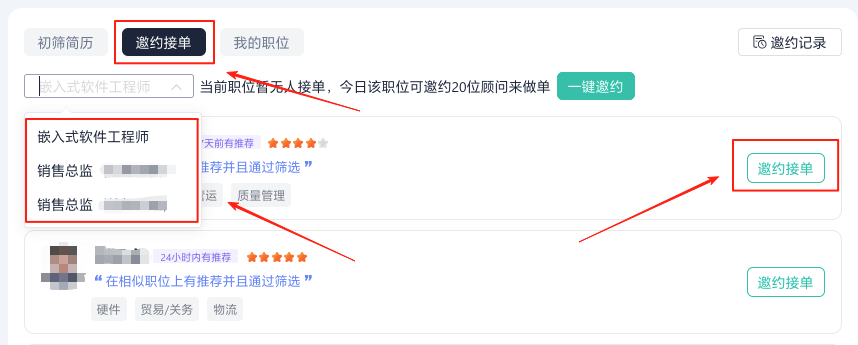 7)职位发布成功后,可在“首页”查看所有已发职位进展,选择对应职位可使用“邀约接单”邀请平台匹配顾问接单;
