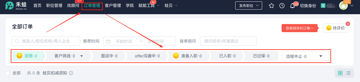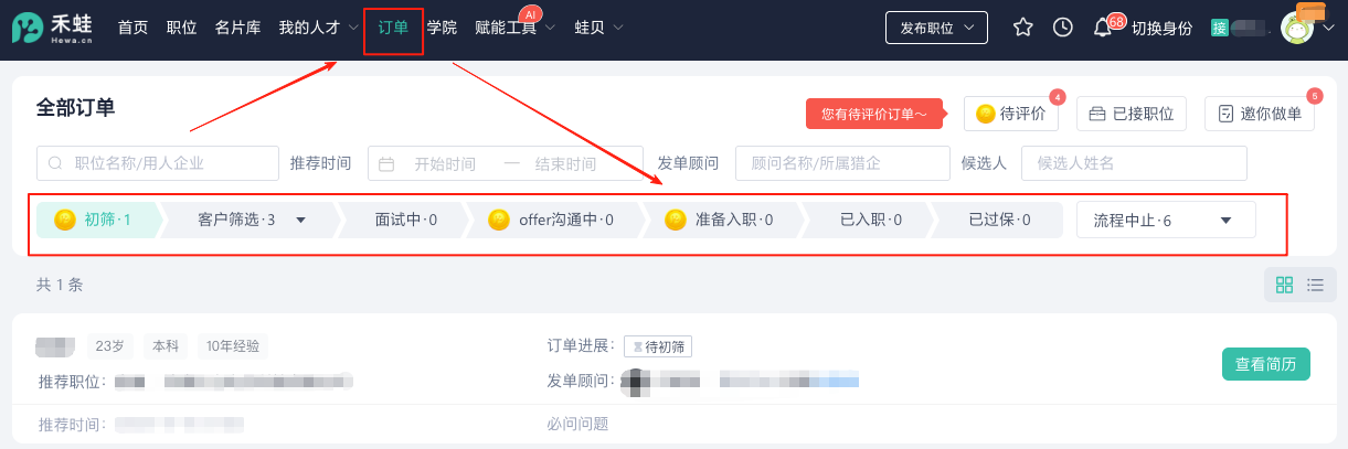 6)从“订单”中可查看所有已推荐的候选人订单进展,是否通过发单方初筛、是否进入面试、是否有offer以及候选人被终止流程的原因。